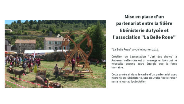 "La Belle Roue" a vue le jour en 2019. Création de l'association "L'art des shows" à Aubenas, cette roue est un manège en bois qui ne nécessite aucune autre énergie que la force humaine. Cette année et dans le cadre d'un partenariat avec notre filière Ebénisterie, une nouvelle "belle roue" verra le jour au lycée Astier.