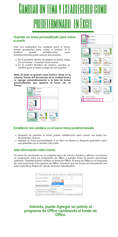 Un tema de documento es un conjunto único de colores, fuentes y efectos. Los temas se comparten entre los programas de Office y pueden tener la misma apariencia uniforme. También puede cambiar el tema de Office. El tema de Office es el esquema de color para todo el programa de Office, mientras que los temas del documento son más específicos (hojas de cálculo de Excel individuales).