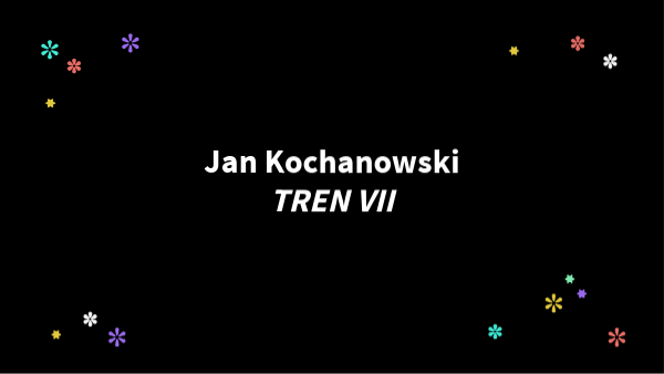 Podmiotem lirycznym w Trenie VII jest ........................, który przeżywa śmierć ........................... Czuje ....................... i ........................... Ten stan potęguje widok ............................... Z głębokim żalem i bólem stwierdza, że ...................nigdy się już w nic nie ubierze. Nie o takiej przyszłości dla córki myśleli rodzice, przecież matka już szykowała ....................... Śmierć wszystko pokrzyżowała. Teraz za cały posag wystarczy ................, .................... i ...........................