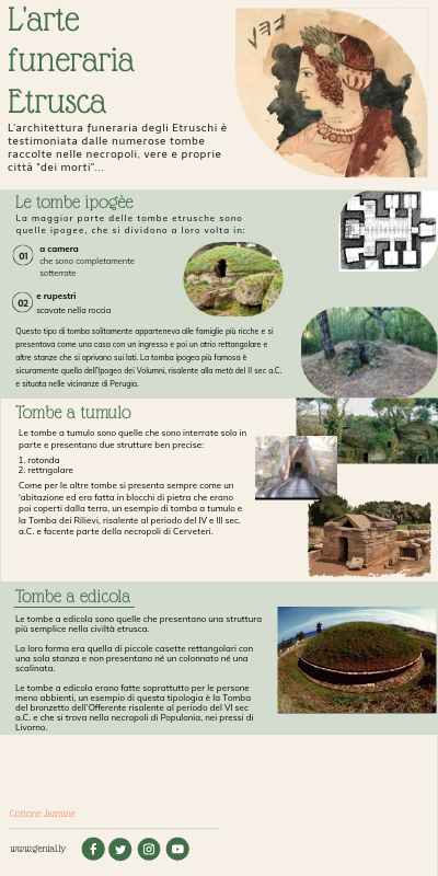Questo tipo di tomba solitamente apparteneva alle famiglie più ricche e si presentava come una casa con un ingresso e poi un atrio rettangolare e altre stanze che si aprivano sui lati. La tomba ipogea più famosa è sicuramente quella dell’Ipogeo dei Volumni, risalente alla metà del II sec a.C. e situata nelle vicinanze di Perugia.