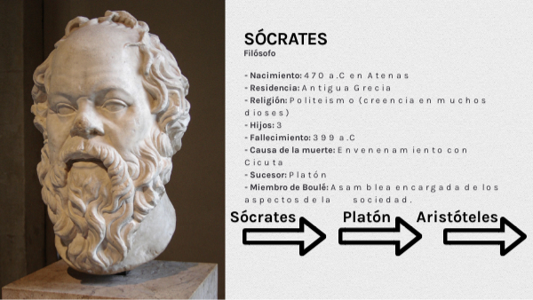 - Nacimiento: 470 a.C en Atenas - Residencia: Antigua Grecia - Religión: Politeismo (creencia en muchos dioses) - Hijos: 3 - Fallecimiento: 399 a.C - Causa de la muerte: Envenenamiento con Cicuta - Sucesor: Platón - Miembro de Boulé: Asamblea encargada de los aspectos de la sociedad.
