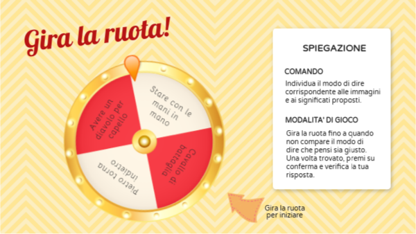 Gira la ruota fino a quando non compare il modo di dire che pensi sia giusto. Una volta trovato, premi su conferma e verifica la tua risposta.