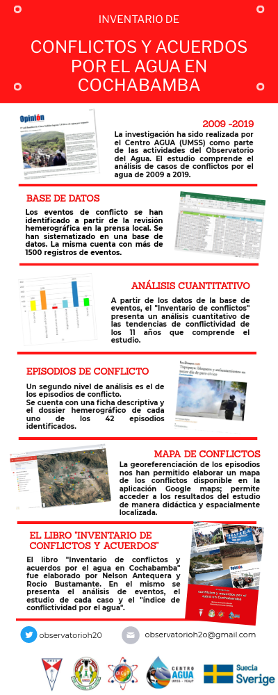 La investigación ha sido realizada por el Centro AGUA (UMSS) como parte de las actividades del Observatorio del Agua. El estudio comprende el análisis de casos de conflictos por el agua de 2009 a 2019.