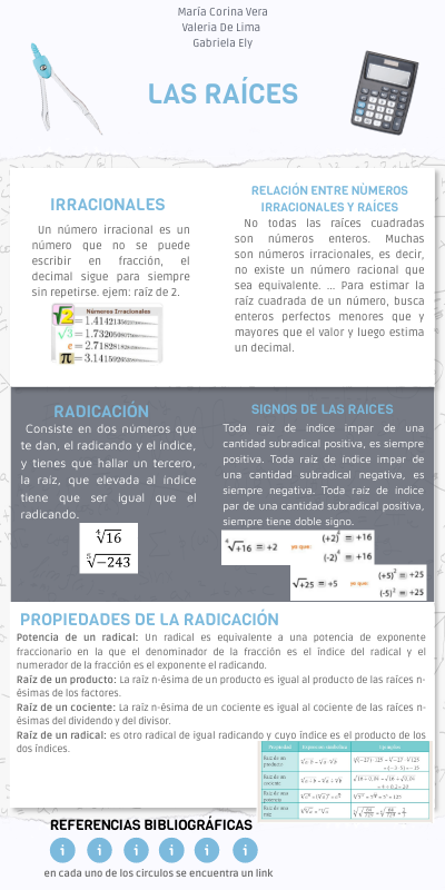 Potencia de un radical: Un radical es equivalente a una potencia de exponente fraccionario en la que el denominador de la fracción es el índice del radical y el numerador de la fracción es el exponente el radicando. Raíz de un producto: La raíz n-ésima de un producto es igual al producto de las raíces n-ésimas de los factores. Raíz de un cociente: La raíz n-ésima de un cociente es igual al cociente de las raíces n-ésimas del dividendo y del divisor. Raíz de un radical: es otro radical de igual radicando y cuyo índice es el producto de los dos índices.