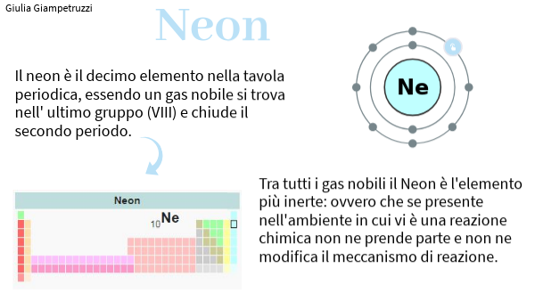 Il neon è il decimo elemento nella tavola periodica, essendo un gas nobile si trova nell' ultimo gruppo (VIII) e chiude il secondo periodo.