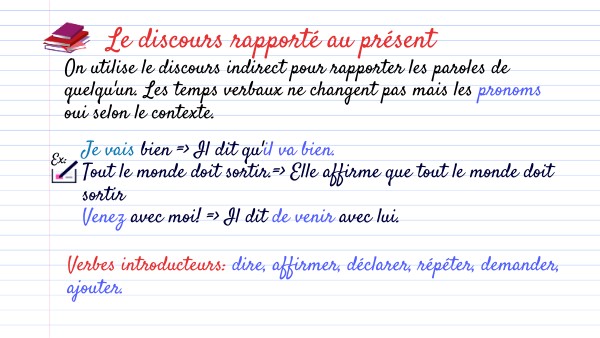 On utilise le discours indirect pour raconter les paroles de quelqu'un. On utilise toujours des verbes introducteurs.