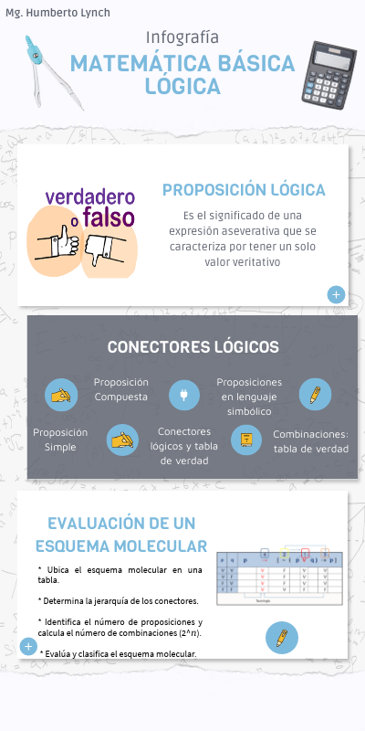 * Ubica el esquema molecular en una tabla. * Determina la jerarquía de los conectores. * Identifica el número de proposiciones y calcula el número de combinaciones (2^𝑛). * Evalúa y clasifica el esquema molecular.