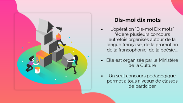 - L'opération "Dis-moi Dix mots" fédère plusieurs concours autrefois organisés autour de la langue française, de la promotion de la francophonie, de la poésie...
