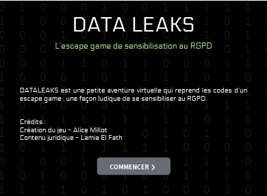 DATALEAKS est une petite aventure virtuelle qui reprend les codes d’un escape game : une façon ludique de se sensibiliser au RGPD. Crédits : Création du jeu - Alice Millot Contenu juridique - Lamia El Fath