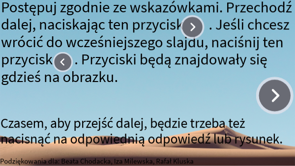 Postępuj zgodnie ze wskazówkami. Przechodź dalej, naciskając ten przycisk . Jeśli chcesz wrócić do wcześniejszego slajdu, naciśnij ten przycisk . Przyciski będą znajdowały się gdzieś na obrazku.