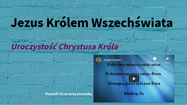 Z tekstów Pisma Świętego dowiadujemy się, że Pan Jezus jest „Królem królów i Panem panów” (Ap 19,16). Gdzie jest to królestwo Pana Jezusa? Królestwo Pana Jezusa jest tam, gdzie jest: - miłość, - wiara, - sprawiedliwość, - przebaczenie, - modlitwa