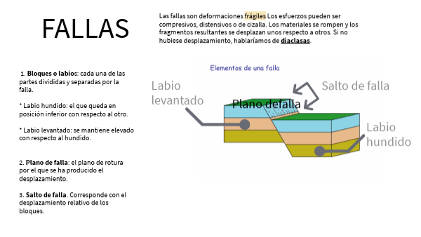1. Bloques o labios: cada una de las partes divididas y separadas por la falla.* Labio hundido: el que queda en posición inferior con respecto al otro.* Labio levantado: se mantiene elevado con respecto al hundido.2. Plano de falla: el plano de rotura por el que se ha producido el desplazamiento. 3. Salto de falla. Corresponde con el desplazamiento relativo de los bloques.