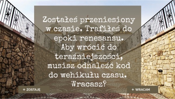 Zostałeś przeniesiony w czasie. Trafiłeś do epoki renesansu. Aby wrócić do teraźniejszości, musisz odnaleźć kod do wehikułu czasu. Wracasz?