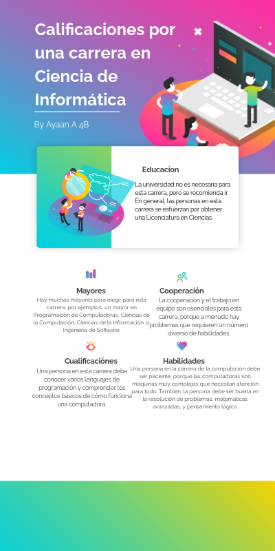 Una persona en la carrera de la computación debe ser paciente, porque las computadoras son máquinas muy complejas que necesitan atención para todo. Tambien, la persona debe ser buena en la resolución de problemas, matemáticas avanzadas, y pensamiento lógico.