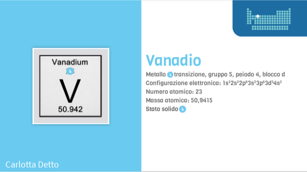 Metallo di transizione, gruppo 5, peiodo 4, blocco d Configurazione elettronica: 1s22s22p63s23p63d34s2 Numero atomico: 23 Massa atomica: 50,9415 Stato solido