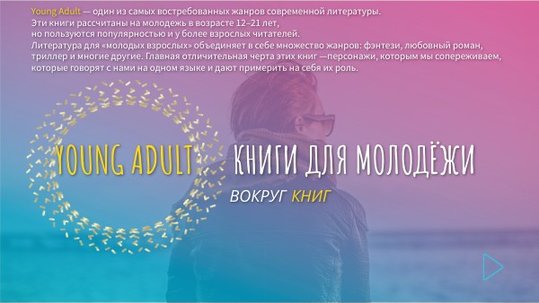 Young Adult — один из самых востребованных жанров современной литературы. Эти книги рассчитаны на молодежь в возрасте 12–21 лет, но пользуются популярностью и у более взрослых читателей. Литература для «молодых взрослых» объединяет в себе множество жанров: фэнтези, любовный роман, триллер и многие другие. Главная отличительная черта этих книг —персонажи, которым мы сопереживаем, которые говорят с нами на одном языке и дают примерить на себя их роль.