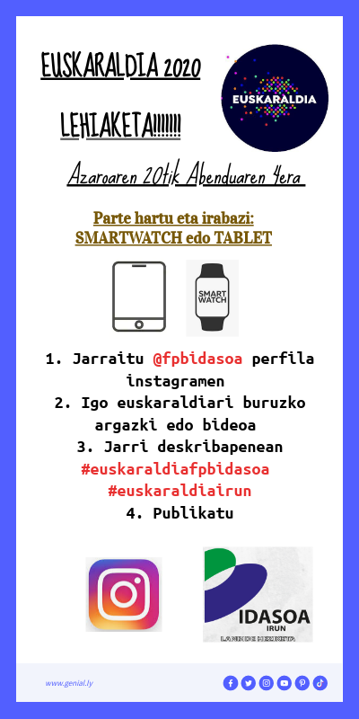 1. Jarraitu @fpbidasoa perfila instagramen 2. Igo euskaraldiari buruzko argazki edo bideoa 3. Jarri deskribapenean #euskaraldiafpbidasoa #euskaraldiairun 4. Publikatu