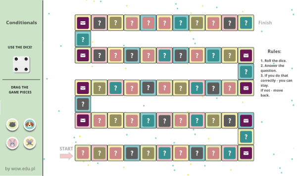 1. Roll the dice. 2. Answer the question. 3. If you do that correctly - you can stay. If not - move back.