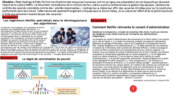 Situation : Reed Hastings et Patty McCord (ex-directrice des ressources humaines) ont mis en ligne une présentation de 124 diapositives résumant l’esprit de la culture Netflix. Ce document, consulté plus de 11 millions de fois, met en avant la confiance dans la gestion des équipes, l’absence de contrôle des salariés considérés comme des « adultes responsables ». L’entreprise va même leur offrir des vacances illimitées pour qu’ils soient plus performants dans leur travail. Cette mesure est cependant largement critiquée dans la Silicon Valley, où la culture de l’effort et de la performance est si forte que personne n’oserait abuser des vacances !