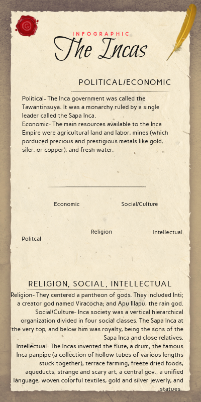 Religion- They centered a pantheon of gods. They included Inti; a creator god named Viracocha; and Apu Illapu, the rain god.Social/Culture- Inca society was a vertical hierarchical organization divided in four social classes. The Sapa Inca at the very top, and below him was royalty, being the sons of the Sapa Inca and close relatives. Intellectual- The Incas invented the flute, a drum, the famous Inca panpipe (a collection of hollow tubes of various lengths stuck together), terrace farming, freeze dried foods, aqueducts, strange and scary art, a central gov., a unified language, woven colorful textiles, gold and silver jewerly, and statues.