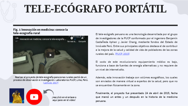 El tele-ecógrafo peruano es una tecnología desarrollada por el grupo de investigadores de la PUCP conformado por el ingeniero Benjamín Castañeda Aphan y Javier Chang, mediante fondos del Estado de Innóvate Perú. Entre sus principales objetivos destaca el de contribuir a la mejora de la salud y calidad de vida de pobladores de las zonas rurales del país. (PUCP, 2015)El costo de este revolucionario equipamiento médico es bajo, funciona a base de fuentes de energía alternativas y no requiere de un nivel de internet alto. Además, esta innovación trabaja con volúmes ecográficos, los cuales son enviados de manera virtual a expertos de la salud, pero que no se encuentran físicamente en la zona. Finalmente, el proyecto fue presentado 24 de abril de 2015, fecha que marcó un antes y un después en la historia de la medicina peruana.