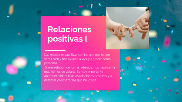 Las relaciones positivas son las que nos hacen sentir bien y nos ayudan a vivir y a crecer como personas. Si una relación de forma reiterada, nos hace sentir mal, hemos de dejarla. Es muy importante aprender a identificar las relaciones positivas y a detectar y rechazar las que no lo son.