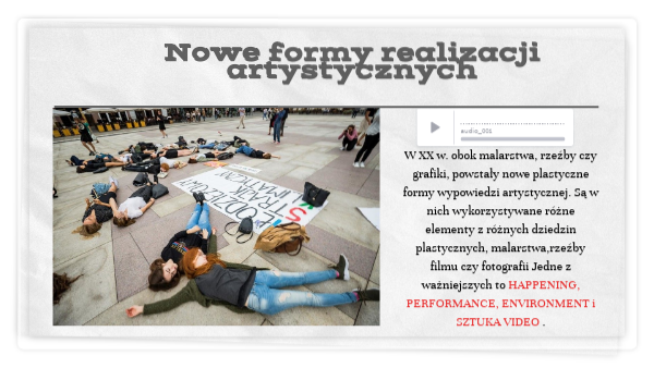 W XX w. obok malarstwa, rzeźby czy grafiki, powstały nowe plastyczne formy wypowiedzi artystycznej. Są w nich wykorzystywane różne elementy z różnych dziedzin plastycznych, malarstwa,rzeźby filmu czy fotografii Jedne z ważniejszych to HAPPENING, PERFORMANCE, ENVIRONMENT i SZTUKA VIDEO .
