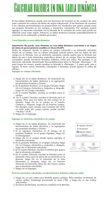 En las tablas dinámicas, puede usar las funciones de resumen en los campos de valor para combinar los valores de datos de origen subyacente. Si las funciones de resumen y los cálculos personalizados no proporcionan los resultados que quiere, puede crear sus propias fórmulas en los campos y elementos calculados. Por ejemplo, podría agregar un elemento calculado con la fórmula de la comisión de venta, que puede ser diferente para cada región. Entonces, la tabla dinámica incluiría automáticamente la comisión en los subtotales y totales generales.