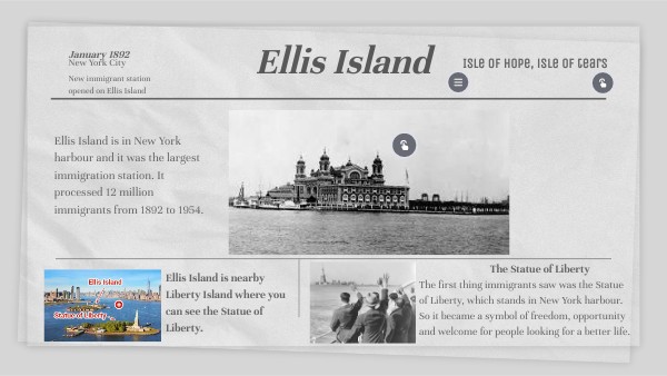 Ellis Island is in New York harbour and it was the largest immigration station. It processed 12 million immigrants from 1892 to 1954.