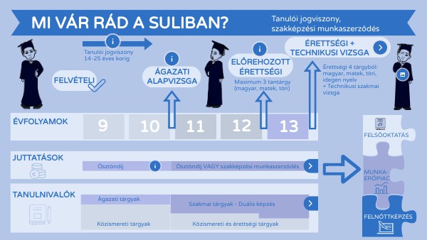A technikus képzés 5 éves. Az első két év ágazati ismereteket adó alapképzés, amit a 2. év végén ágazati vizsga követ. A 11-13. évfolyamon duális képzésben is történhet a képzés. Duális képzés esetén a tanulók szakképzési munkaszerződést kötnek egy céggel, és tényleges munkavégzés közben kapják meg a szakmai tudást. Az iskola vége felé egyre több szakmai tárgyat, és kevesebb közismereti tárgyat kell tanulni. A 13. év végén lesz az érettségi és a technikusi vizsga, így két végzettséget igazoló bizonyítványt kapsz: érettségi bizonyítványt, és a technikusi végzettséget igazoló oklevelet.
