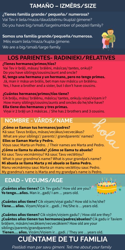 ¿Tienes familia grande/ pequeña/ numerosa?Vai Tev ir liela/maza/daudzbērnu (kupla) ģimene? Do you have big/small/large(number of people) family?Somos una familia grande/pequeña/numerosa. Mēs esam liela/maza/kupla ģimene. We are a big/small/large family.