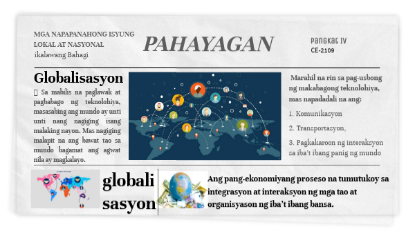 Sa mabilis na paglawak at pagbabago ng teknolohiya, masasabing ang mundo ay unti unti nang nagiging isang malaking nayon. Mas nagiging malapit na ang bawat tao sa mundo bagamat ang agwat nila ay magkalayo.