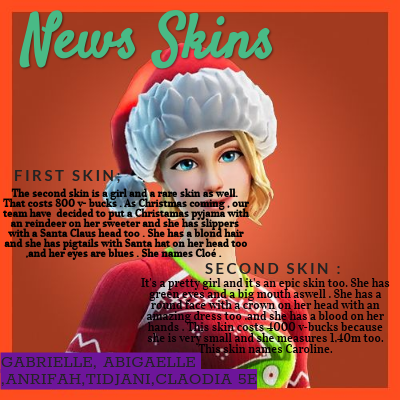 The second skin is a girl and a rare skin as well. That costs 800 v- bucks . As Christmas coming , our team have decided to put a Christamas pyjama with an reindeer on her sweeter and she has slippers with a Santa Claus head too . She has a blond hair and she has pigtails with Santa hat on her head too ,and her eyes are blues . She names Cloé .
