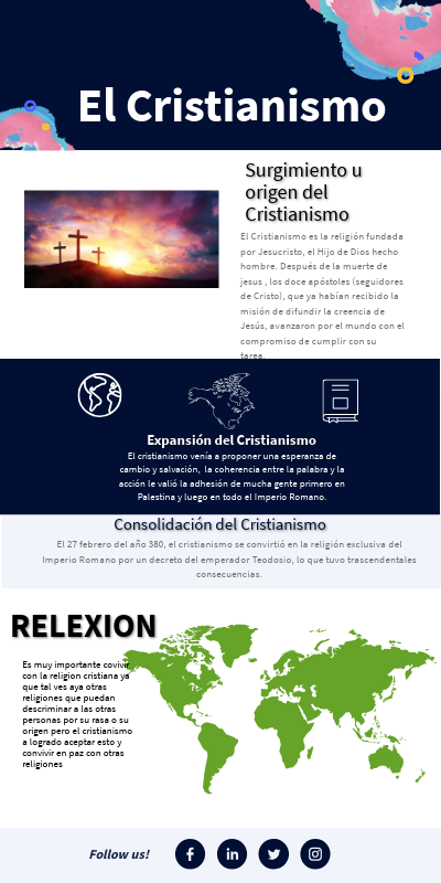 El Cristianismo es la religión fundada por Jesucristo, el Hijo de Dios hecho hombre. Después de la muerte de jesus , los doce apóstoles (seguidores de Cristo), que ya habían recibido la misión de difundir la creencia de Jesús, avanzaron por el mundo con el compromiso de cumplir con su tarea.