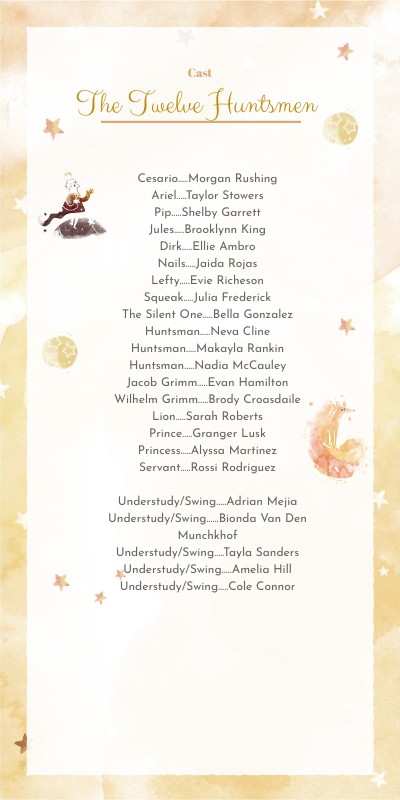 Cesario.....Morgan RushingAriel.....Taylor Stowers Pip.....Shelby Garrett Jules.....Brooklynn King Dirk.....Ellie Ambro Nails.....Jaida Rojas Lefty.....Evie Richeson Squeak.....Julia Frederick The Silent One.....Bella Gonzalez Huntsman.....Neva Cline Huntsman.....Makayla Rankin Huntsman.....Nadia McCauley Jacob Grimm.....Evan Hamilton Wilhelm Grimm.....Brody Croasdaile Lion.....Sarah Roberts Prince.....Granger Lusk Princess.....Alyssa Martinez Servant.....Rossi Rodriguez Understudy/Swing.....Adrian Mejia Understudy/Swing......Bionda Van Den Munchkhof Understudy/Swing.....Tayla Sanders Understudy/Swing.....Amelia Hill Understudy/Swing.....Cole Connor
