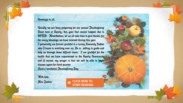 I want to express my gratitude to my Heavenly Father for all the blessings we have received throughout the year. It has been a year like no other, but despite all the bad that has happened let's focus on all the good things that we can count. I am extremely thankful to Mrs. and Mr. Justice, Mr. White, all of the teachers and staff at Equity for the effort they have put in order to keep the school running as its best. I am so thankful to all of my students. They are truly the joy of my days. I thank that I can laugh with them almost everyday, that they feel confident with me to talk about their concerns and that I get to hear ther voices virtually. I love you all, I wish you all a happy Thanksgiving and I am looking forward to see you in person again (hopefully soon).