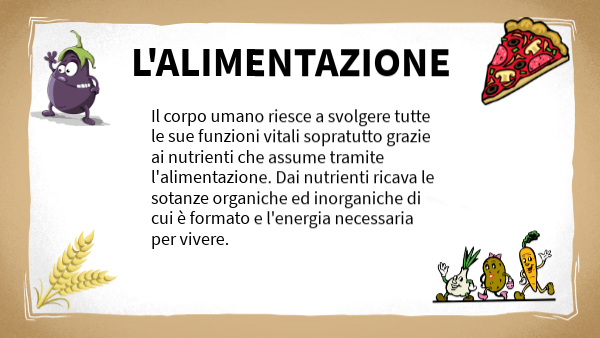Il corpo umano riesce a svolgere tutte le sue funzioni vitali sopratutto grazie ai nutrienti che assume tramite l'alimentazione. Dai nutrienti ricava le sotanze organiche ed inorganiche di cui è formato e l'energia necessaria per vivere.
