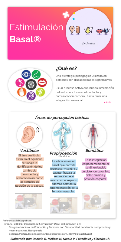 Referencias bibliograficas: Pérez, C,. (2003) El Concepto de Estimulación Basal en Educación. En ICongreso Nacional de Educación y Personas con Discapacidad: conciencia, compromiso y mejora continua. Recuperado de https://estimulacionbasalnet.files.wordpress.com/2017/09/castella.pdf