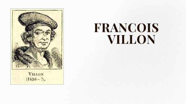 François Villion, est un poète francais du XVe siécle.Malgré le fait qu'il soit le poète le plus célèbre de son époque, les seuls éléments connus sur sa vie sont ses propres écrits littéraires. Dans cet exposé, nous allons retracer les grandes étapes de sa vie: - Enfance - Scolarité - Voleur - Criminel, gracié - Le cambriolage - Poète à la cour du duc d'Orléans - Emprisonnement - Condamnation - Testament