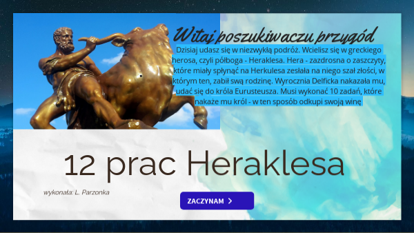 Dzisiaj udasz się w niezwykłą podróż. Wcielisz się w greckiego herosa, czyli półboga - Heraklesa. Hera - zazdrosna o zaszczyty, które miały spłynąć na Herkulesa zesłała na niego szał złości, w którym ten, zabił swą rodzinę. Wyrocznia Delficka nakazała mu, udać się do króla Eurusteusza. Musi wykonać 10 zadań, które nakaże mu król - w ten sposób odkupi swoją winę