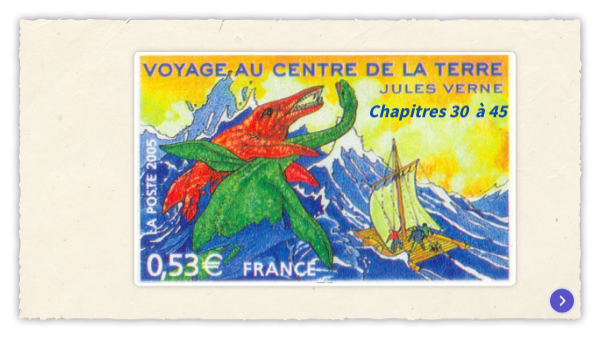 Ils traversent des forêts d’immenses , de fougères et d’arbres primitifs, pleines d’extraordinaires fossiles. Ils naviguent même sur un océan souterrain, peuplé de monstres . Une affreuse les jette sur un rivage, hanté par un troupeau de mastodontes gardé par un . La signature d’ les y attendait, gravée dans le roc. Le scepticisme d’Axel en est ébranlé, pendant que Lidenbrock se montre de plus en plus exalté (chapitres 30-40). Les explorateurs doivent s’ouvrir un passage à l’explosif. Entraînés sur un dans la cheminée d’un , ils sont ramenés par une éruption à la surface de la Terre. Ils se retrouvent ainsi, le 28 août, aux abords de l’île , en Méditerranée, à «plus de douze cents lieues de leur point de départ». Lidenbrock devient , pendant qu’Axel, mûri par l’expérience, épouse filleule du savant (chapitres 41-45).