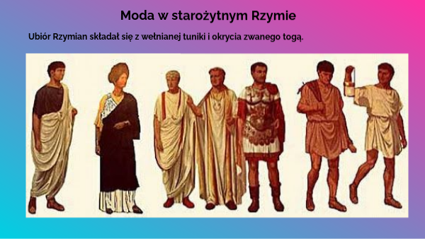 Ubiór Rzymian składał się z wełnianej tuniki i okrycia zwanego togą.