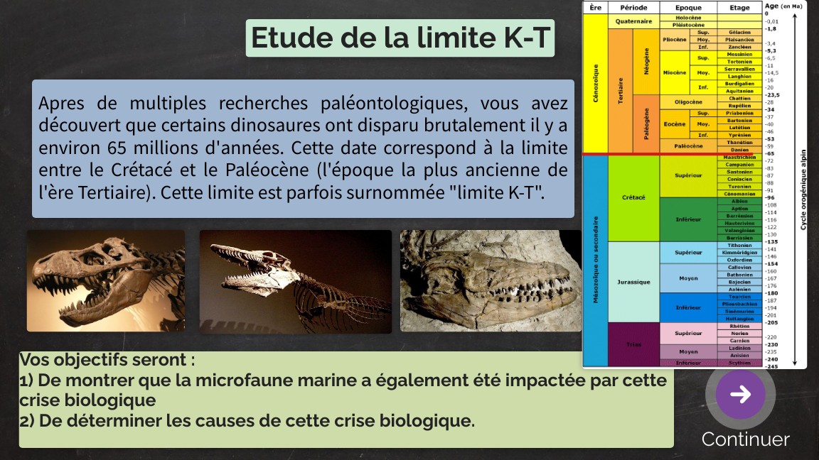 Vos objectifs seront : 1) De montrer que la microfaune marine a également été impactée par cette crise biologique 2) De déterminer les causes probables de cette crise biologique.