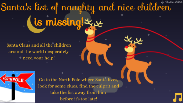 Go to the North Pole where Santa lives, look for some clues, find the culprit and take the list away from him before it's too late!