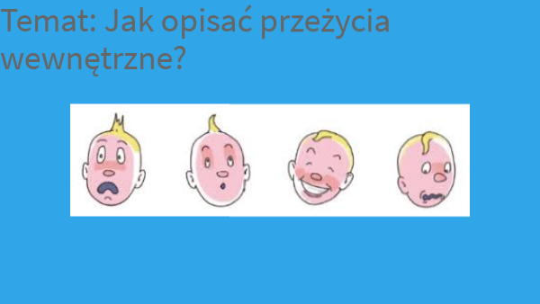 Cel: poprawnie redagujesz opowiadanie zawierające opis przeżyć wewnętrznych. K.S.: -rozpoznajesz i nazywasz emocje, -rozpoznajesz związki frazeologiczne, które oddają przeżywane emocje.