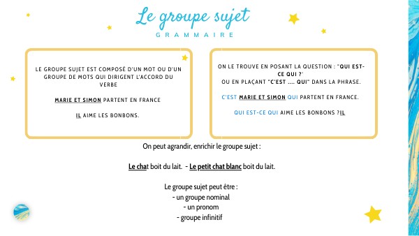 Le groupe sujet est composé d'un mot ou d'un groupe de mots qui dirigent l'accord du verbe MARIE ET siMON PARTENT EN fRANCE iL AIME LES BONBONS.