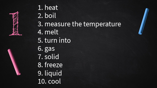 1. heat2. boil 3. measure the temperature 4. melt 5. turn into 6. gas 7. solid 8. freeze 9. liquid 10. cool