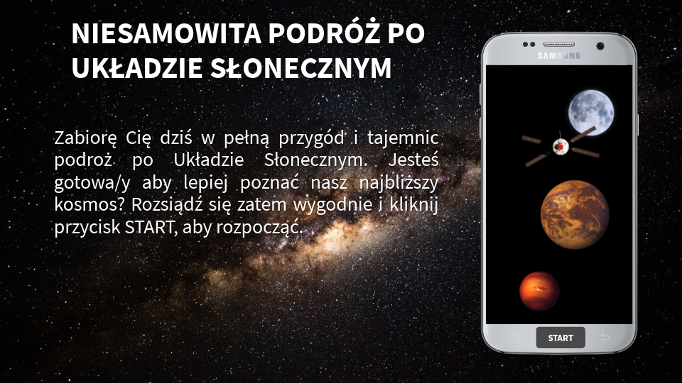 Zabiorę Cię dziś w pełną przygód i tajemnic podroż po Układzie Słonecznym. Jesteś gotowa/y aby lepiej poznać nasz najbliższy kosmos? Rozsiądź się zatem wygodnie i kliknij przycisk START, aby rozpocząć.