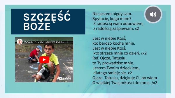Nie jestem nigdy sam. Spytacie, kogo mam? Z radością wam odpowiem, z radością zaśpiewam. x2 Jest w niebie Ktoś, kto bardzo kocha mnie. Jest w niebie Ktoś, kto strzeże mnie co dzień. /x2 Ref. Ojcze, Tatusiu, to Ty prowadzisz mnie. Jestem Twoim dzieckiem, dlatego śmieję się. x2 Ojcze, Tatusiu, dziękuję Ci, bo wiem O wielkiej Twej miłości do mnie. /x2
