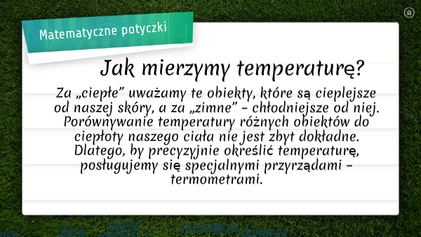 Za „ciepłe” uważamy te obiekty, które są cieplejsze od naszej skóry, a za „zimne” – chłodniejsze od niej. Porównywanie temperatury różnych obiektów do ciepłoty naszego ciała nie jest zbyt dokładne. Dlatego, by precyzyjnie określić temperaturę, posługujemy się specjalnymi przyrządami – termometrami.